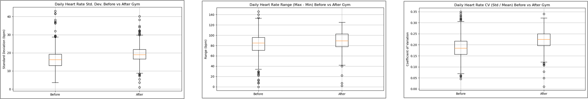 - "심박수 변동폭이 줄어들 것"이라는 가설은 데이터 상에서 명확히 확인되지는 않았다. 오히려 운동 루틴이 생기며, 운동 전보다 운동 후에 **일상 속 심박수의 변화 폭(표준편차, 범위, 변동계수)**이 더 커지는 경향이 관찰되었다.