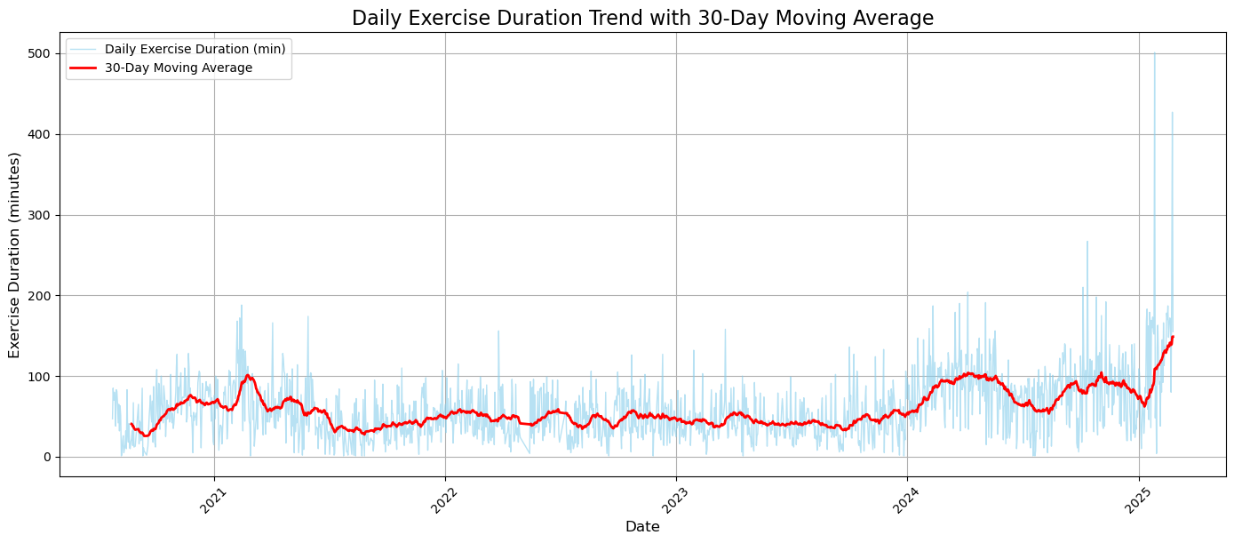 해당 날짜 포함 이전 30일 동안의 평균 운동 시간을 계산한 값으로,
