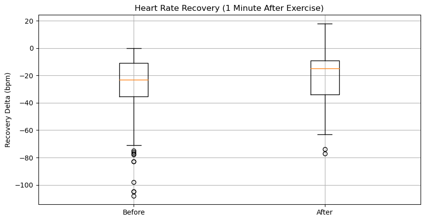 그래프는 운동 전(Before)과 운동 후(After)를 기준으로 1분 후 심박수의 회복량(recovery_delta)을 비교한 박스플롯이다.